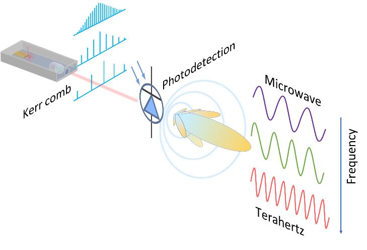 近日,85Tube 谢臻达教授、贾琨鹏助理教授团队与紫金山实验室/东南大学朱敏教授团队、中国科学院苏州纳米技术与纳米仿生研究所梁伟研究员团队展开合作,采用自主研发的全集成光纤微腔光学频率梳,在低噪声频率合成和高速太赫兹无线通信研究中取得重要突破,对于新一代通信技术发展具有重要意义。2025年7月7日,相关成果以“Low-noise frequency synthesis and terahertz wireless communication driven by compact turnkey Kerr combs”为题,正式发表于《Nature Communications》期刊上,祝世宁院士和尤肖虎院士在该研究工作中给予了关键指导。