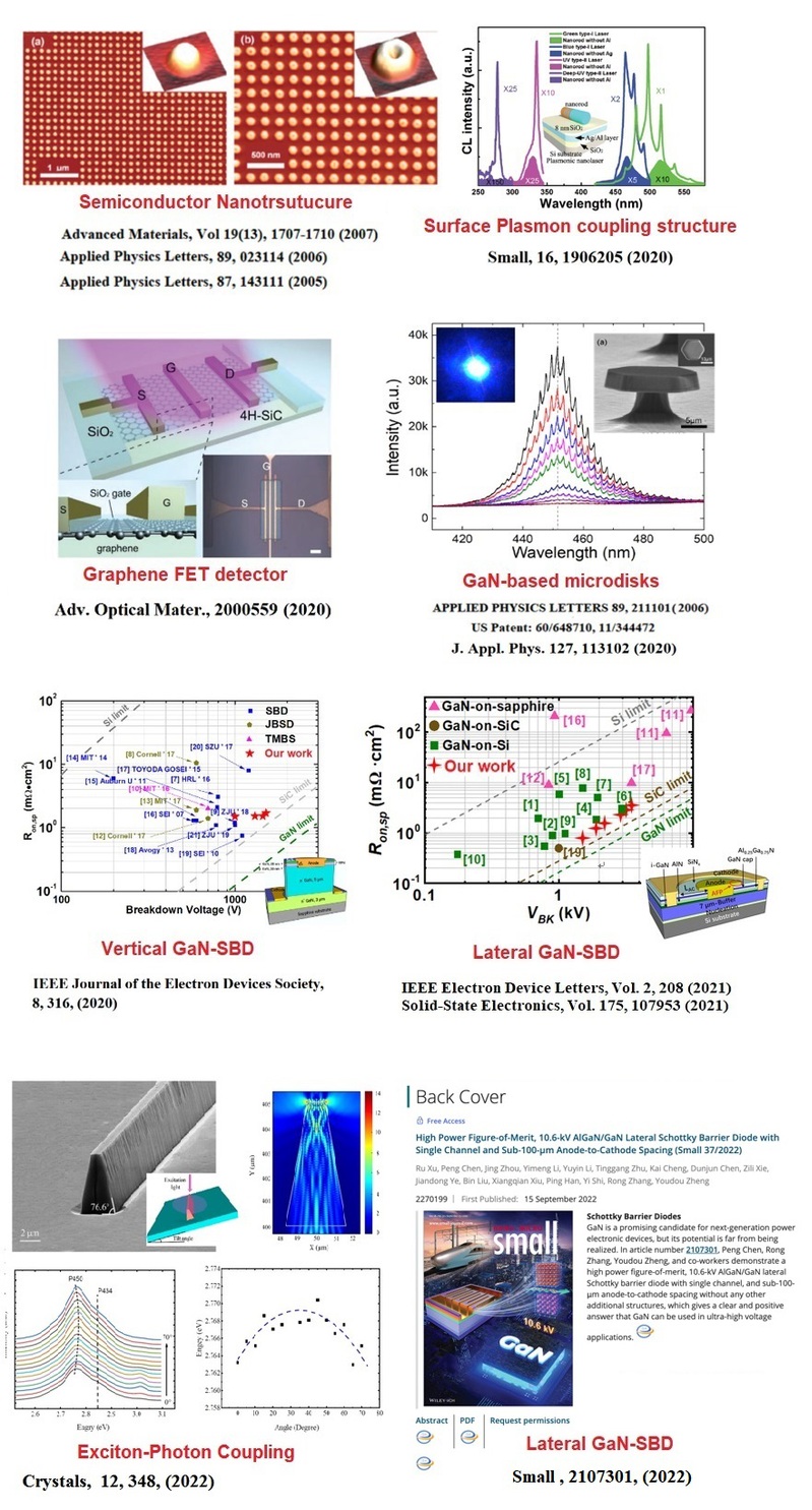 Selected publications 2025 2.Yuyin Li, Peng Chen*, et.al., Cavity Plasmon: Enhanced Luminescence Effect on InGaN Light mitting Diodes, arXiv:2501:04713 (2025). 1. Ziwen Yan, Peng Chen*, et.al. Electromagnetic Nanocoils Based on InGaN Nanorings, Nanomaterials, 15(3):245-249 (2025). 2018 - 2024 (17) 17. Yuyin Li, Jing Zhou, Peng Chen *, et.al., GaN microdisks with a single porous optical confinement layer for whispering gallery mode lasing, Appl. Phys. Lett. 125, 093504 (2024) 16. Ru Xu, Peng Chen *, et.al., A lateral AlGaN/GaN Schottky barrieriode with 0.36-V turn-on voltage and 10-kV breakdown voltage by using ouble-barrier anode structure, Chip, 3, 100079 (2024) 15. Yuyin Li, Peng Chen*, Xianfei Zhang, et.al., The Study on the Lasing Modes Modulated by the Dislocation Distribution in the GaN-Based Microrod Cavities, Nanomaterials, 13, 2228 (2023). 14. Ru Xu , Peng Chen*, Jing Zhou, et.al., High Power Figure-of-Merit, 10.6-kV AlGaN/GaN Lateral Schottky Barrier Diode with Single Channel and Sub-100-μm Anode-to-Cathode Spacing, Small 2022, 2107301, (2022). -- The paper for the back cover. 13. Jing Zhou, Peng Chen*, Zili Xie, et.al., The Sign of Exciton-Photon Coupling in GaN-Based Triangular-like Ridge Cavity, Crystals, 12, 348, (2022). 12. Yimeng Li, Peng Chen*, Xiufang Chen*, et.al., Gate-Controlled NiO/Graphene/4H-SiC Double Schottky Barrier Heterojunction Based on a Metal-Oxide-Semiconductor Structure for Dual-Mode and Wide Range Ultraviolet Detection, ACS APPLIED ELECTRONIC MATERIALS,4 (4) , pp.1807 (2022) 11. Ru Xu , Peng Chen*, Menghan Liu, et.al., 3.4-kV AlGaN/GaN Schottky Barrier Diode on Silicon Substrate With Engineered Anode Structure,IEEE Electron Device Letters, Vol. 2, 208,(2021). 10. Ru Xu , Peng Chen*, Menghan Liu, et.al., 2.7-kV AlGaN/GaN Schottky barrier diode on silicon substrate with recessed-anode structure, Solid-State Electronics, 175, 107953, (2021). 9. Yimeng Li, Peng Chen*, Xiufang Chen*, et.al., High-Responsivity Graphene/4H-SiC Ultraviolet Photodetector Based on a Planar Junction Formed by the Dual Modulation of Electric and Light Fields, Advanced Optical Materials,2000559, (2020). 8. Tao Tao, Ting Zhi, Bin Liu*, Peng Chen*, et.al., Electron-Beam-Driven III-Nitride Plasmonic Nanolasers in the Deep-UV and Visible Region, Small, 16, 1906205, (2020). 7. Ru Xu , Peng Chen*, Menghan Liu, et.al., 1.4-kV Quasi-Vertical GaN Schottky Barrier Diode with Reverse p-n Junction Termination, IEEE Journal of the Electron Devices Society, Vol. 8, 316 (2020). 6. Menghan Liu , Peng Chen*, Jing Zhou, et.al., Realization of regular resonance mode in GaN-based polygonal microdisks on Si,J. Appl. Phys. 127, 113102 (2020). 5. Meng-Han Liu(刘梦涵), Peng Chen(陈鹏)*, Zi-Li Xie(谢自力), et.al., Approach to Single-Mode Dominated Resonant Emission in GaN-Based Square Microdisks on Si, Chin. Phys. Lett. Vol. 37, No. 5, 054204 (2020). 4. Jing Zhou, Peng Chen*, Meng-Han Liu, et.al., Study on the self-absorption of InGaN quantum wells at high photon density, Applied Optics, Vol. 59, No. 16, 4790 (2020). 3. Ningze Zhuo, Na Zhang, Peng Chen* and Haibo Wang*, Enhancement of efficiency and CCT uniformity for red phosphor thin films, red LEDs and laminated white LEDs based on near-ultraviolet LEDs using MgO nanoparticles, RSC Advances,9, 28291, (2019). 2. Ningze Zhuo, Na Zhang, Teng Jiang, Peng Chen* and Haibo Wang*, Effect of particle sizes and mass ratios of a phosphor on light color performance of a green phosphor thin film and a laminated white lightemitting diode, RSC Advances, 9, 27424, (2019). 1. Jiang, Fulong; Liu, Yaying; Chen, Peng*; et al.,The Study on the Droop Effect in the InGaN/AlGaInN MQWs With Lattice-Matched AlGaN/InGaN Superlattices Barrier by Highly Excited Photoluminescence Measurementctions,IEEE PHOTONICS JOURNAL,10, 8200509,(2018). 2008 - 2017 (1) 1. Yang, G. F.; Chen, P.*; Wang, M. Y.; et al., Selective epitaxy of InGaN/GaN multiple quantum wells on GaN side facets, PHYSICA E-LOW-DIMENSIONAL SYSTEMS & NANOSTRUCTURES Volume: 45 Pages: 61-65 Published: AUG 2012 1998 - 2007 (14) 1. P. Chen, A. Chen,S. J. Chua, and J. N. Tan,Growth and Optical Properties of Highly Uniform and Periodic InGaN Nanostructures, ADVANCED MATERIALS, Vol 19(13), 1707-1710, 2007 2. P. Chen, S. J. Chua, and J. N. Tan, High-density InGaN nanodots grown on pretreated GaN surfaces,APPLIED PHYSICS LETTERS, 89, 023114, 2006 3. P. Chen, S. J. Chua, Y. D. Wang, M. S. Sander, and C. G. Fonstad, InGaN Nanorings and Nanodots by Selective Area Epitaxy, APPLIED PHYSICS LETTERS, 87, 143111, 2005 4. H.W.Choi, K.N.Hui, P.Lai, P.Chen, X.H.Zhang, S.Tripathy, J.H.Teng, and S.J.Chua, Lasing in GaN microdisks pivoted on Si, APPLIED PHYSICS LETTERS, 89, 211101, 2006 7. P. Chen*, R. Zhang, Z.M. Zhao, D.J. Xi, B. Shen, Z.Z. Chen, Y.G. Zhou, S.Y. Xie, W.F. Lu, Y.D. Zheng, Growth of high quality GaN layers with AlN buffer on Si(111) substrates, Journal of Crystal Growth, 225, 150–154, 2001 8. Chen, P*; Shen, B; Zhu, JM; et al. Microstructures of GaN buffer layers grown on Si(111) using rapic thermal process low-pressure metalorganic chemical vapor deposition, Chinese Physics Letters, Volume: 17, Issue:3, Pages:224-226 2000. 9. P. Chen*, S.Y. Xie, Z.Z. Chen, et. al. Deposition and crystallization of amorphous GaN buffer layers on Si(111) substrates, Journal of Crystal Growth, 213, 27-32, 2000 10. Chen, P*; Zhang, R; Xu, XF; et al. The oxidation of gallium nitride epilayers in dry oxygen, Applied Physics A-Materials Science & Processing, Volume: 71, Issue: , 2Pages: 191-194, 2000. 11. Chen, P*; Shen, B; Zhang, R; et al. Two-step growth of GaN quantum dots with metalorganic chemical vapor deposition, Materials Research Society Symposium Proceedings, Volume: , 512 Pages: 65-68, Published: 1998. 12. Chen Peng, Chua Soo-Jin, Miao Zhonglin and Tripathy Sudhiranjan, “Method and Structure for Fabricating III-V Nitride Layers on Silicon Substrates” Patent application filed on 2 February 2005 in US patent office, granted in 2